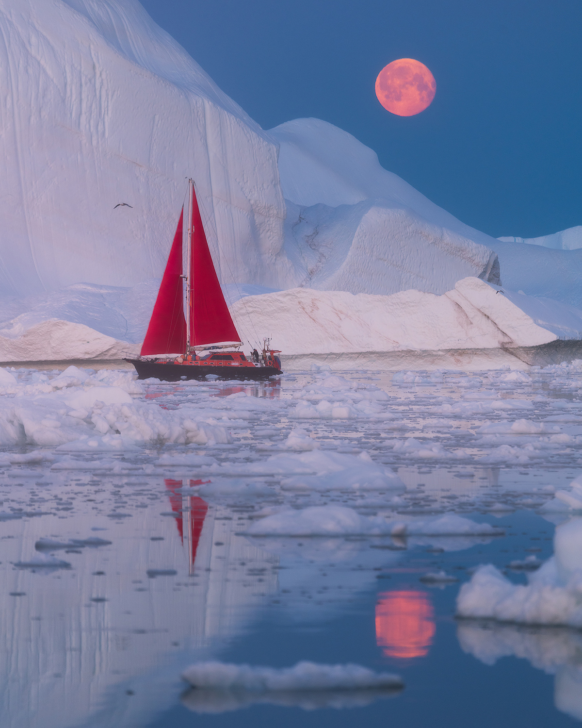 In July 2015, I was leading an expedition in West Greenland when we decided to demonstrate the size and scale of the icebergs by introducing the striking contrast of red sails. The sails, like a brushstroke on a white canvas, felt like a vivid graphic element and a metaphor for the rising sun, and they even reflected the colours of the Greenland flag.